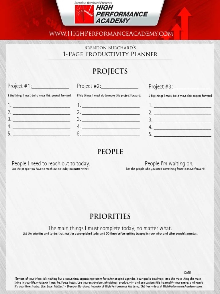 High Performance Academy 1 Page Productivity Planner